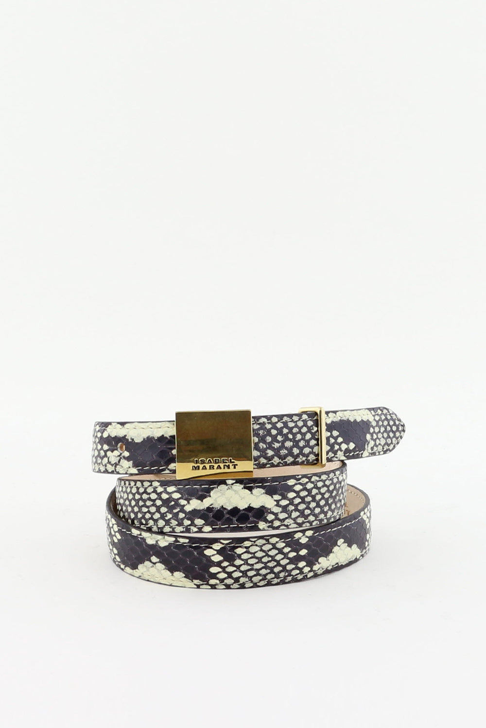 Riem van het merk Isabel Marant, model Lowell, in het crème/ slangenprint. De riem is voorzien van gouden details en is in verschillende maten verkrijgbaar. De zorgvuldige afwerking en het vakmanschap van Isabel Marant zijn duidelijk te zien, wat resulteert in een riem van kwaliteit. De riem is 2 cm breed.