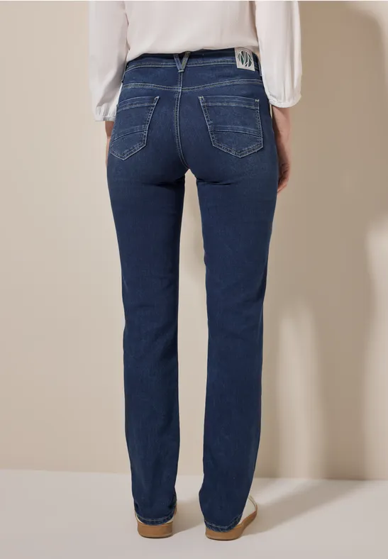 Deze jeans met rechte pijpen van CECIL voor dames in een mid-waist ontwerp maakt indruk met zijn klassieke blauwe wassing en knoopsluiting. De rechte pijpen en de katoenmix met stretch bieden een comfortabele pasvorm en veelzijdige stylingopties. Perfect voor een tijdloze casual look.