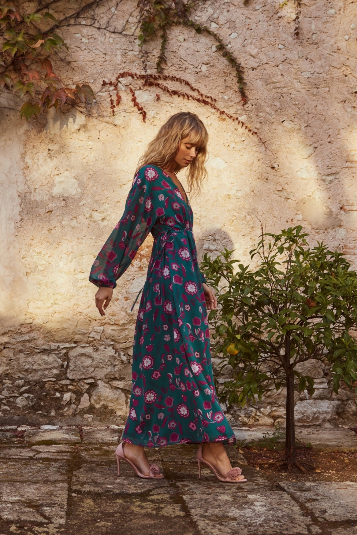 Jurk Caela is een lange jurk met print en V-hals. De taille is verstelbaar met koordjes zodat je de vorm kunt aanpassen. De elegante jurk valt relaxed en beweegt soepel mee. Materiaal: 86% polyester, 14% katoen Model en fit: Relaxed fit. Het model is 1.74 m en draagt maat S. Lengte jurk: 139 cm bij maat S