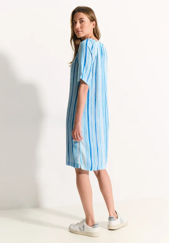 De gestreepte damesjurk van CECIL is een levendige zomerjurk met korte mouwen en een geplooide ronde halslijn voor een speelse touch. Het veelkleurige streeppatroon geeft de jurk een frisse uitstraling. Dankzij de fijne crêpe textuur en zachte viscosestof is de jurk comfortabel om de hele dag te dragen.