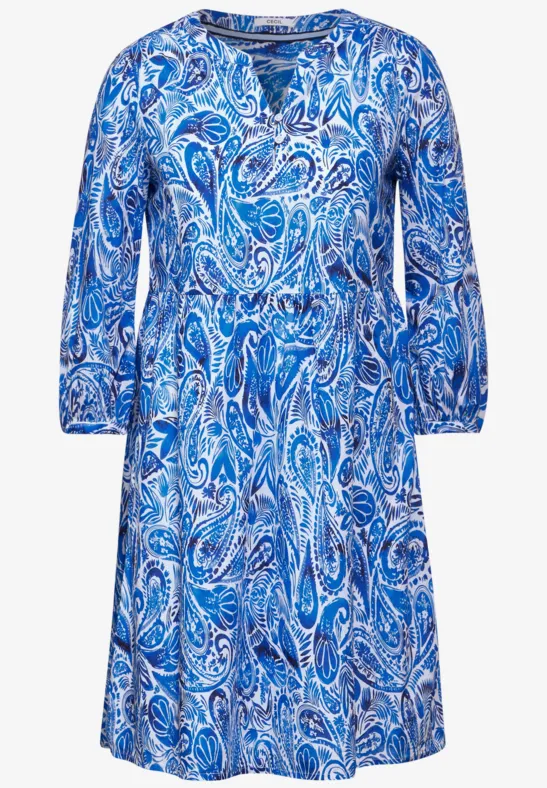 De jurk van CECIL is een zomers kledingstuk voor dames met een silhouet tot op de knie. Met zijn 3/4-mouwen met manchetten, ronde hals met split en elegante knooppas biedt hij een casual, maar toch stijlvolle look. Het paisley-patroon geeft de zomerjurk een speels tintje en de stof van zuiver katoen is comfortabel om te dragen.