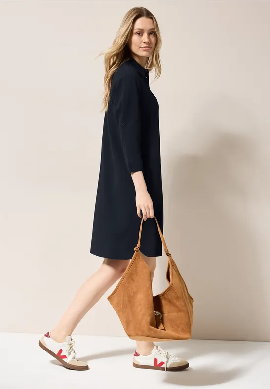 Deze korte jurk van CECIL voor dames combineert een moderne structuur met casual details. De overhemdkraag en decoratieve knoopsluiting zorgen voor een klassieke touch, terwijl 3/4 mouwen met omslag zorgen voor een casual look. De materiaalmix met stretch biedt een comfortabele pasvorm.