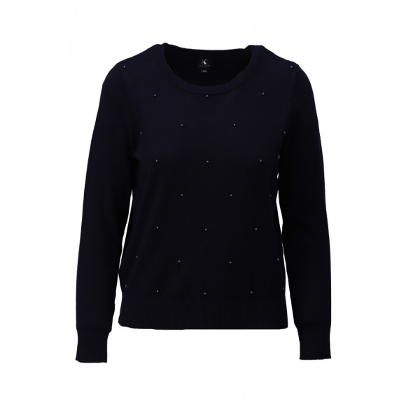 Trui van het merk K-Design. Deze donkerblauwe trui heeft een subtiele, maar feestelijke uitstraling dankzij de kleine kraaltjes die all-over verwerkt zijn op de voorkant. Het model heeft een ronde hals en lange mouwen, en is afgewerkt met ribboorden aan de zoom, hals en manchetten.