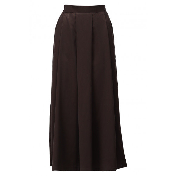 Rok van het merk K-Design. Deze donkerbruine glans maxi rok heeft een elegante, vloeiende pasvorm en is voorzien van een brede plooi aan de voorzijde, wat zorgt voor een stijlvolle en luxueuze uitstraling. De hoge tailleband accentueert het silhouet en maakt de rok comfortabel om te dragen.