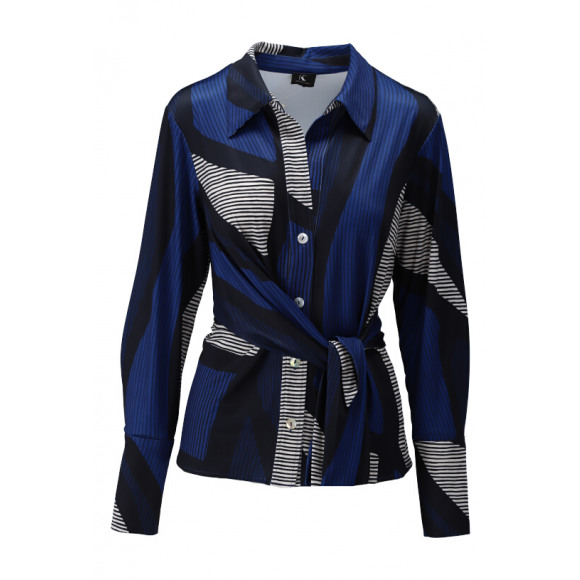Blouse met kraagje en allover print van het merk K-design. Deze blouse heeft een knoopsluiting met daaroverheen een aparte wikkel. Hierdoor valt de blouse heel elegant en slank.