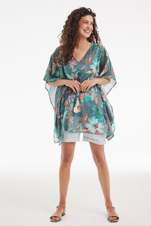 Kaftan Lagoon Reflection print: Tijdloos Comfort in Stijl Ervaar de charme van de Kaftan Lagoon Reflection print, een groen meesterwerk van 100% katoen dat je uitnodigt voor moeiteloze elegantie. Met deze kaftan ben je klaar voor zonnige dagen met een lichte en vrolijke uitstraling. De natuurlijke ademende eigenschappen van katoen zorgen voor een luchtige ervaring, ideaal voor de warmere seizoensdagen. Het loose fit model biedt een comfortabele pasvorm, terwijl de elegante V-hals en het subtiele taillekoordje een speelse touch toevoegen. Stijladvies Draag de Kaftan Lagoon Reflection print boven een eenvoudige legging of combineer met je favoriete sandalen voor een relaxte strandlook. De opvallende print voegt een vleugje kleur toe, perfect om je dagelijkse stijl op te fleuren. Ideaal voor zowel casual uitstapjes als zomerse avonden. Wasvoorschrift Wasvoorschrift: Wassen doe je op 30 graden om de kleur en zachtheid van het katoen langer te behouden. Gebruik een mild wasmiddel voor het beste resultaat. Droogvoorschrift: Vermijd de droger en laat deze kaftan aan de lucht drogen. Dit voorkomt krimp en houdt de stof in topconditie. Strijkvoorschrift: Als je behoefte hebt aan een strijkbeurt, doe dit dan op lage temperatuur om de stof te beschermen en de print levendig te houden. Laat je inspireren door de Kaftan Lagoon Reflection print en voeg een stralende touch toe aan je outfit!
