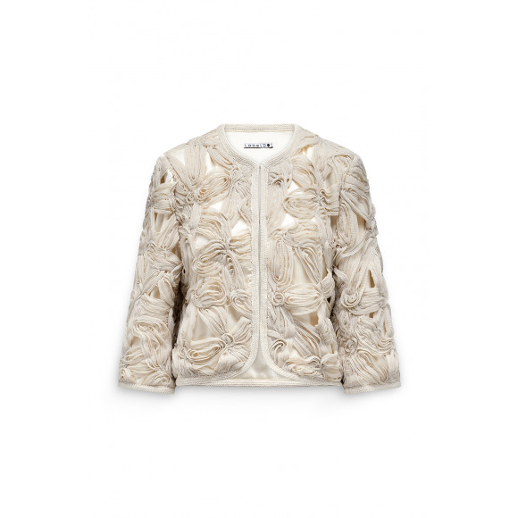 Jasje van het merk Label Dot. Dit verfijnde jasje is een echte eyecatcher dankzij het bijzondere opengewerkte design met speelse, geborduurde lussen. De zachte crème tint en subtiele glans geven het item een elegante en vrouwelijke uitstraling. De korte, rechte pasvorm maakt het perfect om te dragen over een top of jurk en voegt direct een stijlvolle finishing touch toe aan elke outfit.