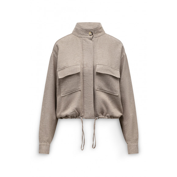 Jasje van Label DOT. Dit korte jasje in een warme zandtint met subtiele metallic glans is een echte eyecatcher. De stoere klepzakken op de borst en de hoge kraag geven het ontwerp een moderne, krachtige uitstraling, terwijl de koordsluiting in de zoom zorgt voor een speels en vrouwelijk silhouet. De licht glanzende structuurstof maakt dit item perfect voor een stijlvolle statement look.