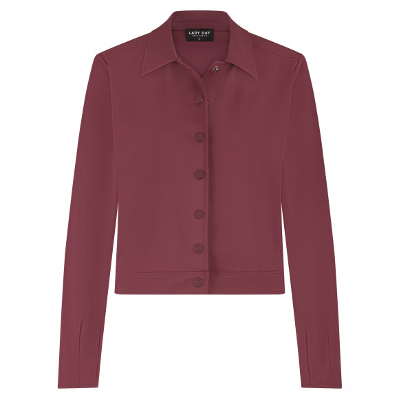 Jasje van Lady Day. Dit stijlvolle jasje in een diepe bordeauxrode tint is een echte must-have voor het seizoen. Het korte model met knoopsluiting en klassieke kraag geeft je outfit een elegante en moderne uitstraling. De elastische band aan de achterzijde zorgt voor extra comfort en een mooie pasvorm.