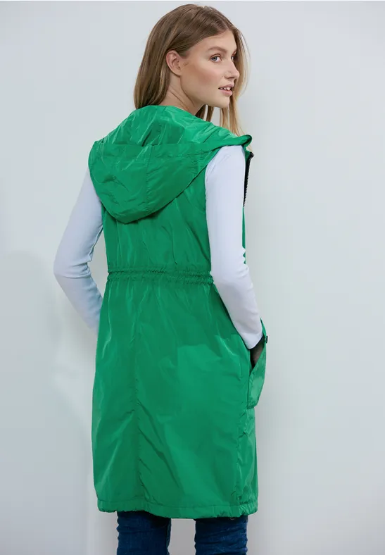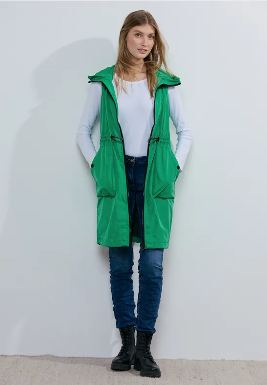 De CECIL damesbodywarmer voor het overgangsseizoen is een veelzijdig kledingstuk met capuchon, ritssluiting, steekzakken met knoopsluiting en een trekkoord. Deze lange bodywarmer is perfect voor casual outfits en zorgt tegelijkertijd voor comfort en functionaliteit. Of het nu over een trui of een shirt met lange mouwen is, het is een stijlvol onderdeel van je garderobe.