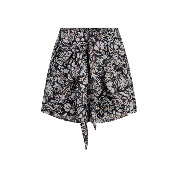 Dit is nog eens een speels shortje. Het shortje heeft namelijk een wikke/overslag aan de voorkant die je met een knoop of strik sluit. Dit shortje bevat geen stretch, maar heeft wel en elastische boord en een rits aan de zijkant.