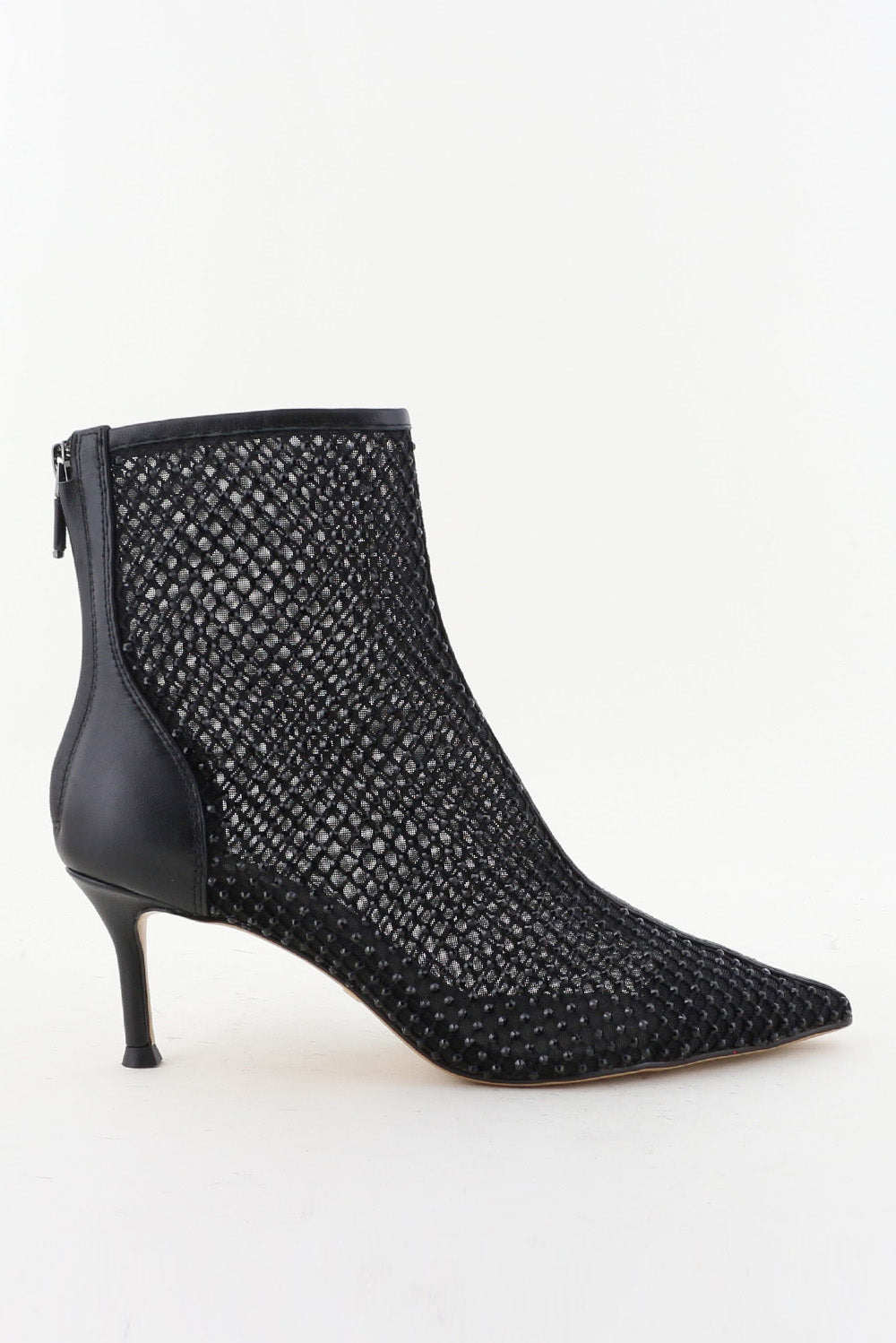 Hier zie je de enkellaarsjes met mesh en strassteentjes van Lola Cruz. Het netachtige ruitpatroon valt direct op en geeft het zwarte ontwerp een subtiele structuur. De puntige neus is afgewerkt met kleine glanzende steentjes die licht vangen. De smalle gebogen hak geeft het silhouet een rustige lijn zonder te overdrijven. Het leer en textiel voelen stevig en soepel aan. De pasvorm valt normaal, je kunt dus uitgaan van je eigen maat. Lola Cruz staat bekend om zorgvuldig gemaakte schoenen met speelse details, en dat zie je hier mooi terug.
