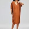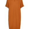 Stijlvol Ontspannen in de Long Loose Dress Elena in Ginger Brown De Long loose dress Elena in Ginger brown is de perfecte aanvulling op jouw garderobe. Deze prachtige jurk in een warme beige/bruine tint biedt een loose fit die bijdraagt aan een comfortabele en moeiteloze look. Met een V-hals en korte mouwen straalt de jurk een casual elegantie uit, perfect voor een zorgeloze, luchtige dag. De regular waist zorgt ervoor dat je er altijd stijlvol uitziet, ongeacht de gelegenheid. Gemaakt van Hoogwaardige Stof De jurk is vervaardigd van 95% Vorteks viscose en 5% elasthan, wat zorgt voor een uitzonderlijk zachte en soepele stof. Vorteks viscose staat bekend om zijn ademende en lichte eigenschappen, ideaal voor een warme dag. De toevoeging van elasthan geeft net dat beetje extra stretch, waardoor de jurk altijd comfortabel zit. Deze combinatie van materialen is niet alleen duurzaam, maar zorgt ook voor een luxe gevoel tijdens het dragen. Stijladvies Combineer de Long loose dress Elena in Ginger brown met je favoriete accessoires voor een complete look. De jurk staat prachtig met een heerlijke broek of een strakke jeans voor een casual uitstraling. Voeg een paar sandalen of hakken toe om je outfit helemaal af te maken. Door de veelzijdigheid van de jurk ben je klaar voor zowel een ontspannen dag als een chic avondje uit. Wasvoorschrift Wassen: Was de jurk op 30 graden om de stof in topconditie te houden. Droogvoorschrift: Vermijd de droger en laat de jurk aan de lucht drogen om krimp te voorkomen. Strijkvoorschrift: Strijk op lage temperatuur voor een gladde en verzorgde look. Vermijd bleken en chemisch reinigen om de kwaliteit van de stof te behouden. Met de Long loose dress Elena in Ginger brown haal je een veelzijdig en stijlvol kledingstuk in huis dat je het hele jaar door moeiteloos kunt dragen.
