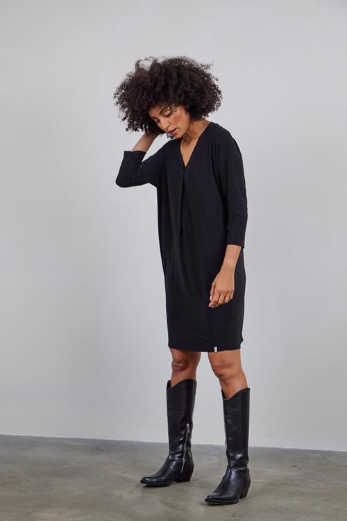 Eindeloze Stijl met Loose Dress Sandy Black Met de Loose dress Sandy Black zul je altijd het perfecte kledingstuk klaar hebben hangen. Dit zwarte jurkje combineert elegantie met moeiteloos comfort. De driekwart mouwen geven het een moderne flair, terwijl de V-hals zorgt voor een verfijnde uitstraling. Deze jurk heeft een loose fit, waardoor je je vrij en comfortabel kunt bewegen, ideaal voor elke dag. Gemaakt van Hoogwaardige Stof De Loose dress Sandy Black is gemaakt van een hoogwaardige mix van 96% polyester en 4% elasthan. Deze combinatie zorgt voor een duurzame, kreukvrije stof die zacht aanvoelt op de huid. Het biedt een lichte stretch, waardoor de jurk soepel om je lichaam valt en je bewegingsvrijheid behoudt. Ideaal voor elke gelegenheid, van een zonnige dag tot een avondje uit. Stijladvies Deze jurk is perfect te dragen met zowel casual sneakers als elegante hakken. Voeg een kleurrijke sjaal of opvallende accessoires toe voor een persoonlijke touch. Voor een formele look kun je de jurk combineren met een nette blazer. De loose fit zorgt ervoor dat je moeiteloos schakelt tussen verschillende stijlen, zonder in te boeten op comfort. Wasvoorschrift Wasvoorschrift: Was de jurk op maximaal 30 graden voor langdurig plezier en optimale vormbehoud. Droogvoorschrift: Hang de jurk na het wassen meteen op om te drogen. Vermijd de droger om de stof in perfecte staat te houden. Strijkvoorschrift: Strijken is meestal niet nodig dankzij de kreukvrije stof, maar indien nodig, strijk de jurk op een lage temperatuur. Met de Loose dress Sandy Black ben je klaar voor elke dag met stijl en comfort binnen handbereik.