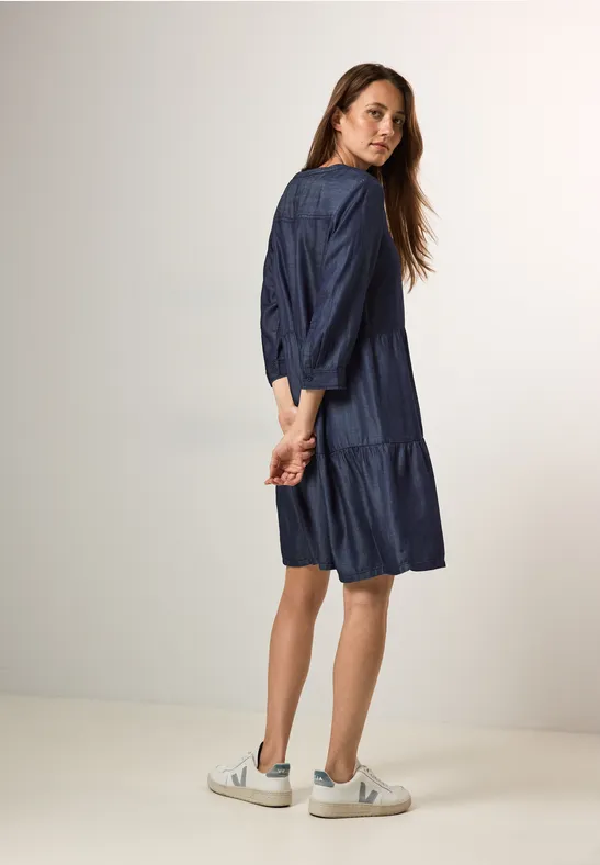 Deze knielange lyocell-jurk van CECIL heeft een casual denimlook en is voorzien van een overhemdkraag en een decoratieve knoopsluiting. Zijzakken voegen praktische details toe aan de jurk, terwijl de aangenaam zachte lyocell-stof zorgt voor een hoog draagcomfort. Perfect voor een ongecompliceerde maar stijlvolle look.