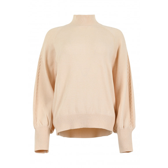 Trui van Maicazz. Deze zachte zandkleurige trui is een tijdloze basic met een vrouwelijke twist. De hoge ronde hals en de subtiele kabeldetails langs de mouwen geven het ontwerp een elegante uitstraling. De trui heeft een comfortabele, iets lossere pasvorm en geribde boorden voor een mooie aansluiting.