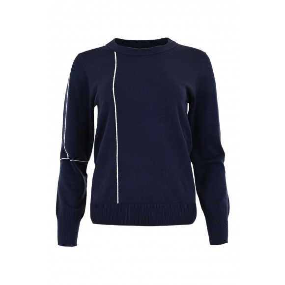 Trui van Maicazz. Deze navy knit met witte contraststiksels is minimalistisch met een moderne twist. De rechte lijnen geven een grafisch effect en maken deze trui perfect voor een stijlvolle, no-nonsense look.