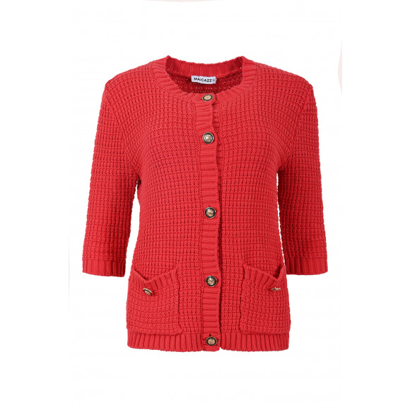Gebreid vestje van het merk Maicazz. Dit vestje heeft gouden knopen, 2 zakken, een ronde hals en driekwart mouwen.