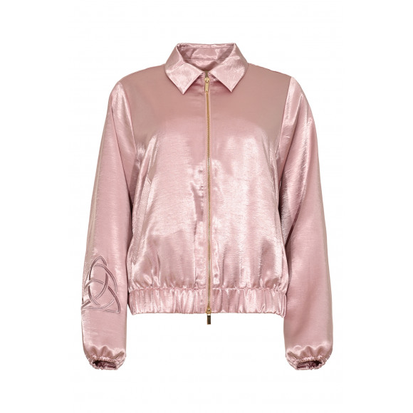 Jasje van Maicazz. Deze opvallende jacket in een zachte slate rose tint heeft een luxe satijnlook met een subtiele glans. De klassieke kraag en goudkleurige ritssluiting geven het model een stijlvolle uitstraling, terwijl de elastische boorden zorgen voor een sportieve touch. Het ton-sur-ton logo detail op de mouw maakt het ontwerp eigentijds en herkenbaar.