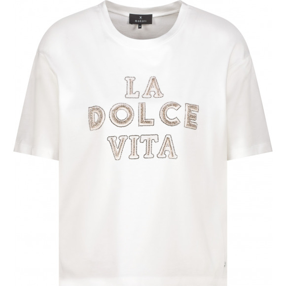 T-shirt met korte mouwen van het merk Monari in een frisse witte kleur. Een stijlvolle basic met een opvallend detail: de tekst La Dolce Vita is versierd met subtiele strass-steentjes, wat zorgt voor een elegante en speelse uitstraling. De zachte stof en comfortabele pasvorm maken dit shirt perfect voor een casual maar toch verzorgde look.