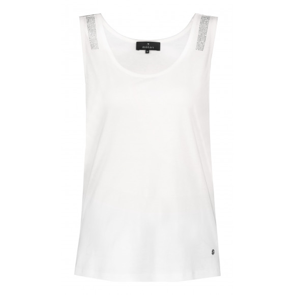 Top met brede bandjes van het merk Monari. Deze top heeft een dubbele ronde hals en de brede bandjes zijn versierd met strass steentjes.