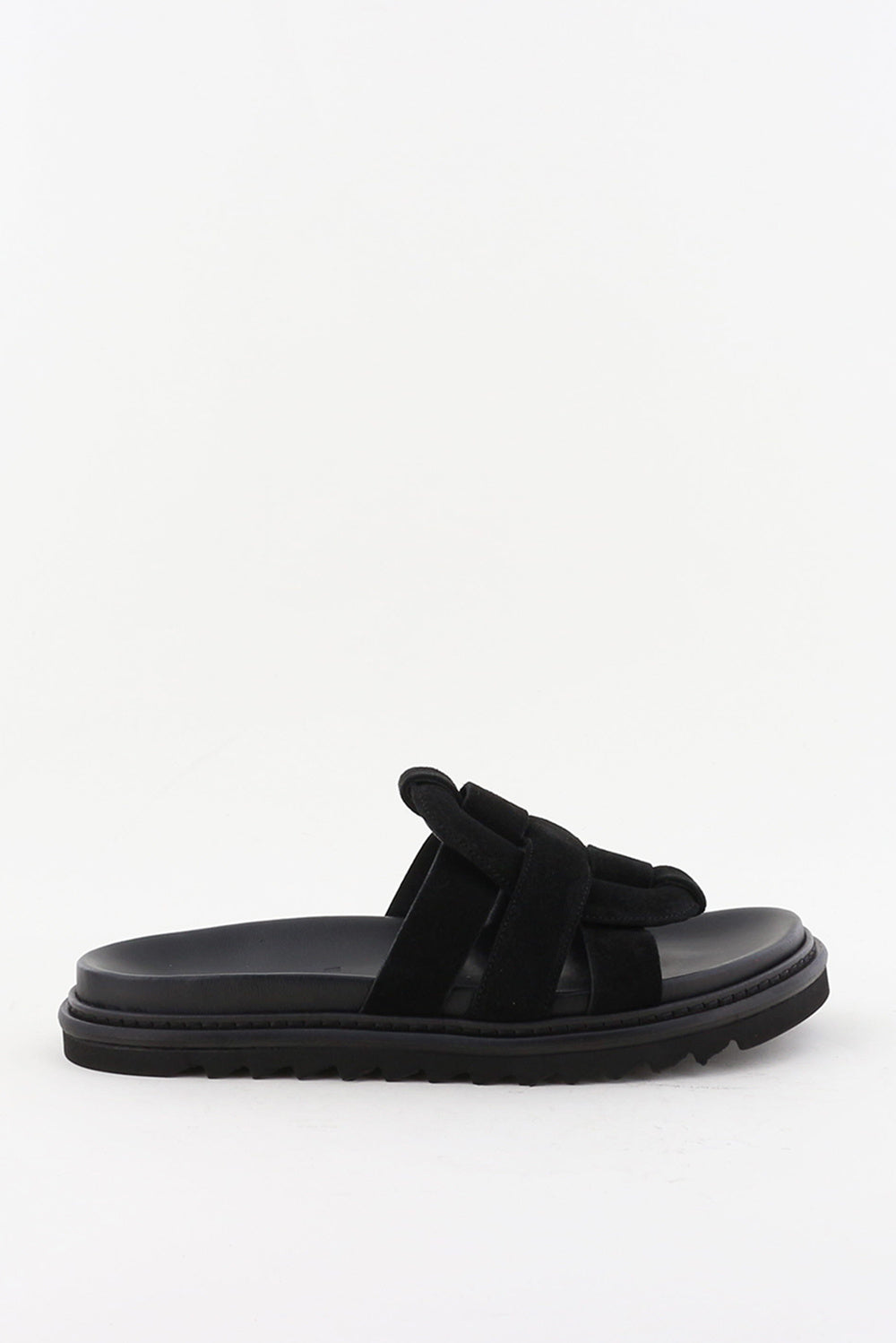Dit zijn de sandalen Emilia zwart van Morobe, een stevige sandaal met brede suède banden die kruislings over de voet liggen. De bovenste band is licht gedraaid, waardoor er een zachte lus ontstaat die mooi om de wreef valt. Het suède voelt vol aan en vormt soepel mee rond de voet. De grove, geribbelde zool geeft wat hoogte en voelt stabiel onder je. De binnenkant is uitgevoerd in leer, wat prettig draagt op warme dagen. Ze vallen normaal, dus je kunt je gebruikelijke maat kiezen. Morobe werkt met zorg aan elk detail vanuit hun atelier in Antwerpen, waarbij de herkenbare vormtaal en rijke materialen centraal staan in elk ontwerp.