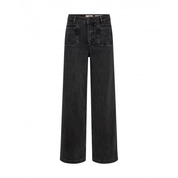 Jeans van Mos Mosh. Deze zwarte wide leg jeans van Mos Mosh is een moderne essential met een stoere twist. De jeans heeft een flatterende high waist, rechte pijpen en opvallende zakdetails aan de voorkant. De subtiele washed look geeft de broek karakter zonder in te leveren op verfijning.