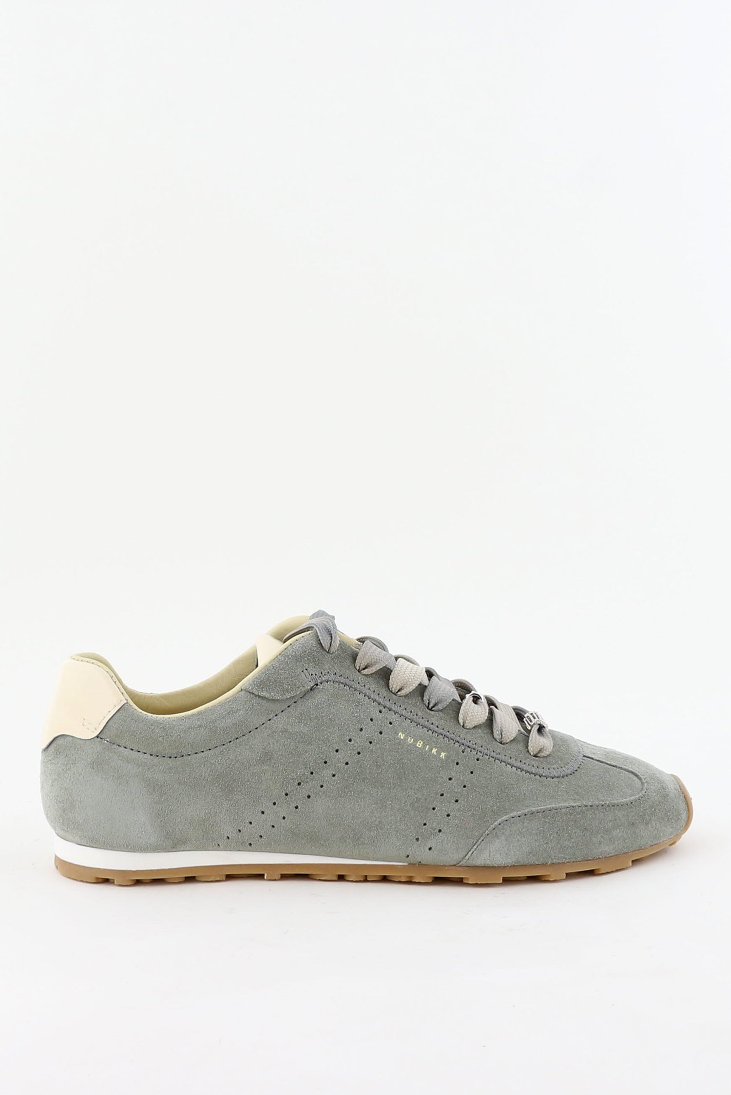 Hier zie je de sneakers Billy Lou van Nubikk in een rustige grijsgroene tint met een zachte lichtbeige hiel. Het suede en lakleer vormt een stevige, gladde mix van materialen die goed aansluit op de voet. De twee rijen fijne perforaties aan de zijkant zorgen voor lichte structuur. De lichtbruine zool met grof profiel voelt robuust aan en geeft de sneaker een stoere basis. Deze sneakers vallen normaal op maat, dus je kunt je eigen maat kiezen. Nubikk staat bekend om ontwerpen die nieuwe technieken en vormen gebruiken en dat zie je hier duidelijk terug.