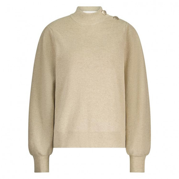 Trui van Nukus. Deze beige trui is een stijlvolle basic met een vleugje glamour. De subtiele glans in de stof en de goudkleurige sierknopen op de schouder geven een chique twist aan het eenvoudige silhouet. De rechtvallende pasvorm en licht opstaande hals zorgen voor een moderne, vrouwelijke uitstraling.
