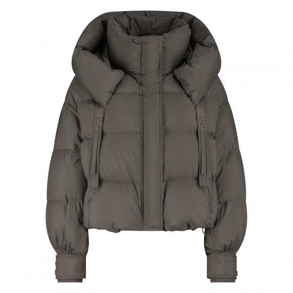 Puffer jas van Nukus. Deze warme en stijlvolle jas in een prachtige taupe kleur heeft een korte, moderne pasvorm en een royale capuchon. De gewatteerde stof en de elastische boorden zorgen voor optimaal draagcomfort en warmte tijdens koude dagen.