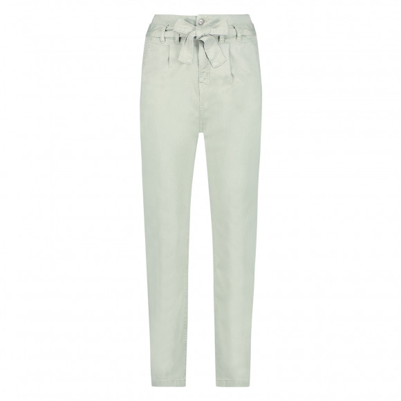 Hoge paperbag broek met strikceintuur en bandplooi. In een prachtige salie groene kleur. De broek heeft lekkere stretch en valt hoog.