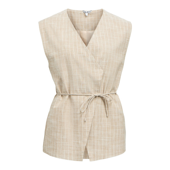 Gilet van merk Object. Dit stijlvolle item heeft een moderne, minimalistische uitstraling met een subtiele krijtstreep in een zachte beige tint. De mouwloze snit en het overslagdetail geven het gilet een elegante, vrouwelijke look, terwijl het strikceintuur zorgt voor een mooi getailleerd silhouet. De lichte stof maakt het perfect voor een verfijnde, zomerse outfit.