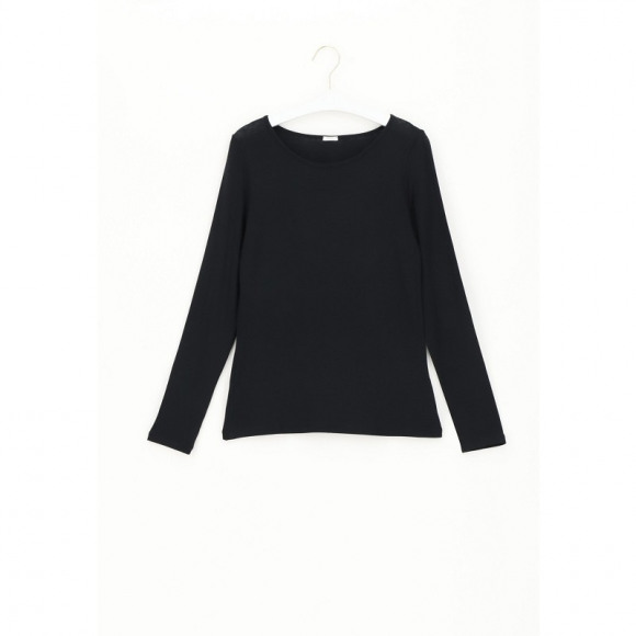 Dit zwarte t-shirt met ronde hals en lange mouw zorgt voor een aangename warmte door de toevoeging van cahsmere (9%). Het shirt is dun en zacht (de cashmere prikt niet) en is perfect voor onder jouw truien, blouses en jurken die anders net te koud zijn om in de winter te dragen. Probeer het en ervaar het zelf. De thermosstaat kan thuis een graadje lager 😉