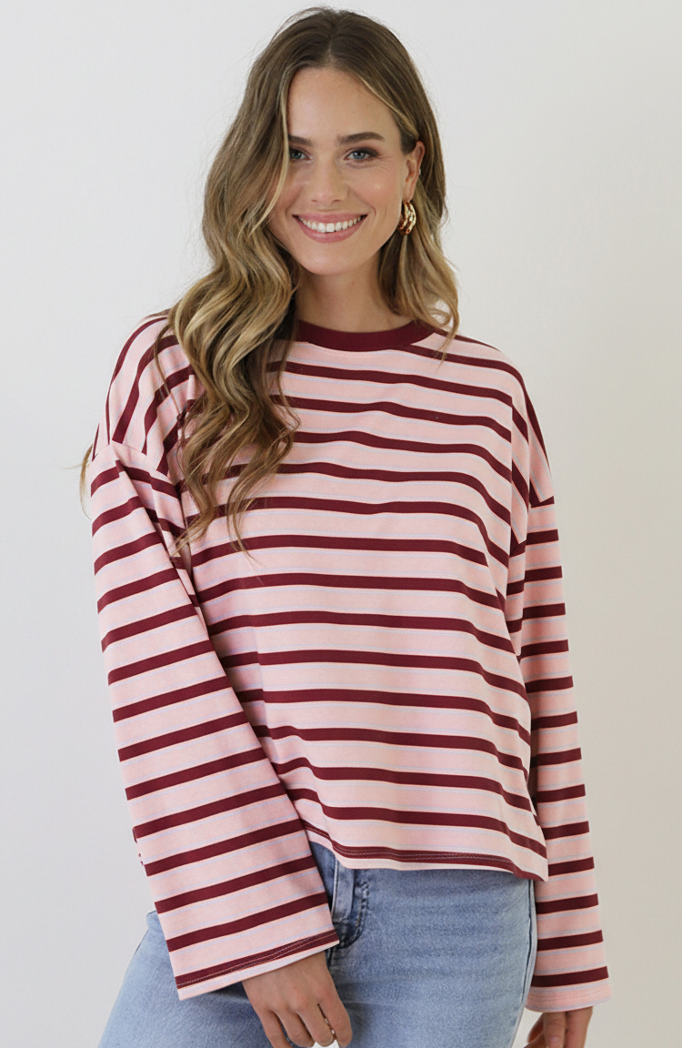 Oversized Gestreepte Katoenen Top Tricolore Burgundy Roze