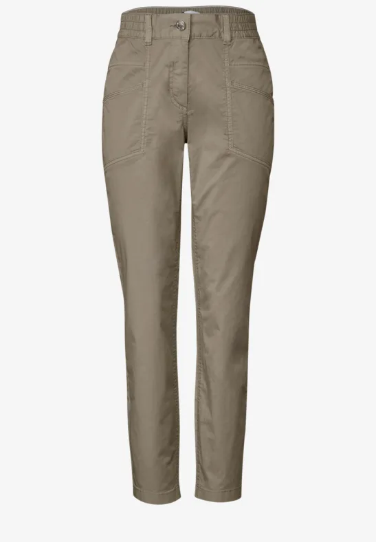 Deze damesbroek van CECIL maakt indruk met zijn casual pasvorm en moderne papertouch-stof. De Mid Waist en Slim Legs zorgen voor een flatterend silhouet. Zijzakken en een knoopdetail op de tailleband geven deze broek een stijlvolle touch.