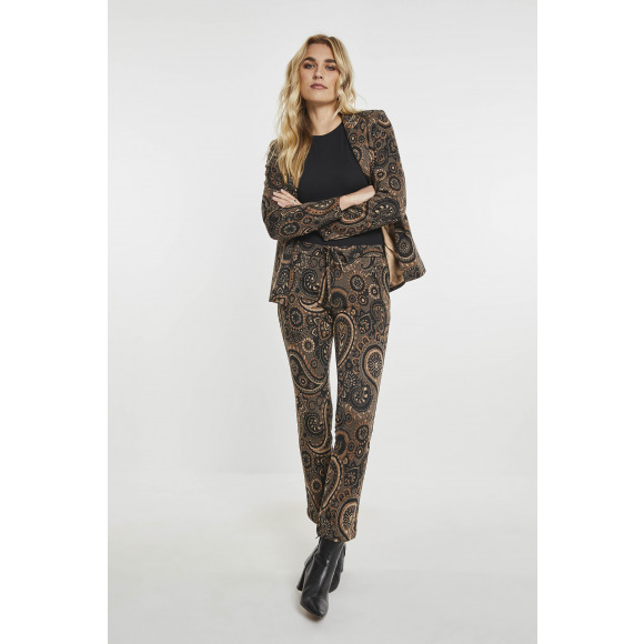 Super zachte broek in geweven jacquard. De broek heeft een zwart/zand/camel paisley print. De elastieken boord is voorzien van een koordje.