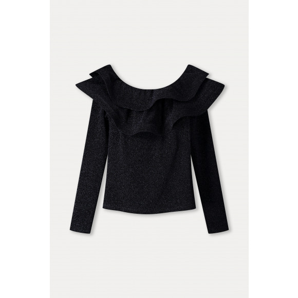 Top van POM Amsterdam. Deze zwarte glittertop is een echte statement piece dankzij de opvallende volantdetails langs de halslijn. De subtiele glans en de elegante pasvorm maken dit item perfect voor feestelijke gelegenheden. Met de lange mouwen en het vrouwelijke silhouet combineer je stijl en comfort moeiteloos.