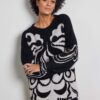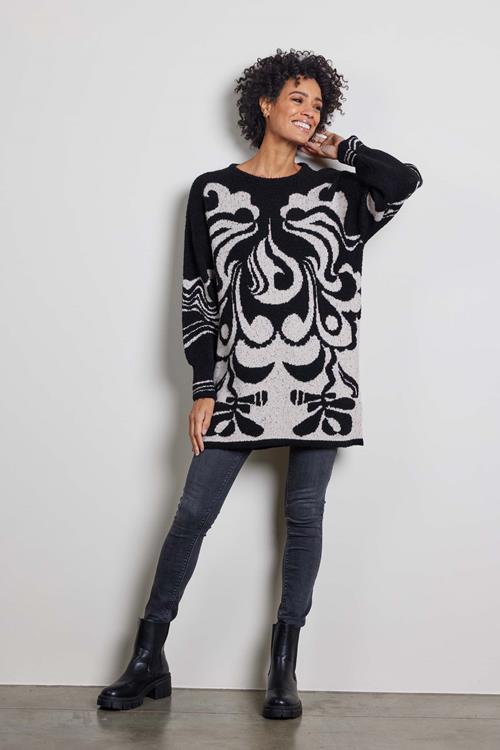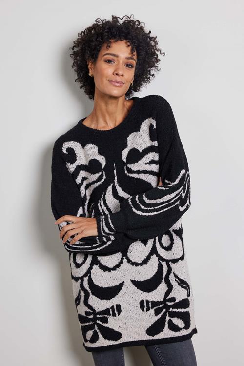 Lange trui in een jaquard breisel. De trui valt wijd en heeft een ronde hals. Aan de onderzijde van de mouwen zitten manchetten en een aan de onderkant van de trui een smalle boord. Gemaakt van acryl met viscose in zwart met beige. Leuk om te dragen op een legging of strakke jeans.