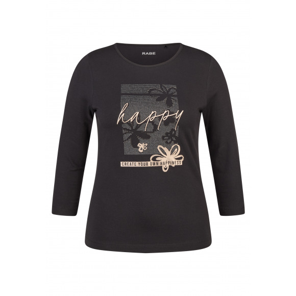 Shirt van het merk Rabe. Dit zwarte shirt heeft een ronde hals en 3/4-mouwen. Op de voorzijde staat een stijlvolle print met bloemmotief, strassteentjes en de tekst “happy” in sierlijke letters, aangevuld met de inspirerende quote “create your own happiness”. Gemaakt van een zachte, elastische katoenmix voor optimaal draagcomfort en een mooie pasvorm.