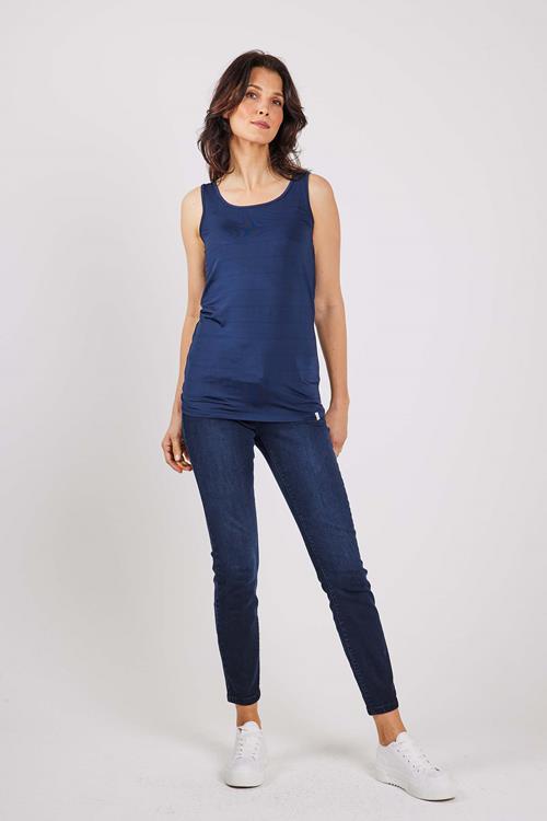 Veelzijdige Rayon singlet in Dark Navy Ervaar de ultieme veelzijdigheid met de Rayon singlet in Dark Navy. Dit mouwloze model is perfect ontworpen in een prachtige blauwe kleur die bij elke gelegenheid past. Het regular fit design biedt een rechte pasvorm en een stijlvolle ronde hals, waardoor je het eenvoudig kunt dragen tijdens warme dagen of als basislaag in koelere seizoenen. Dit singlet belooft een tijdloze aanvulling te zijn op je garderobe. Gemaakt van hoogwaardige stof Het singlet is vervaardigd uit een hoogwaardige mix van 90% rayon en 10% elasthan. Deze combinatie zorgt voor een zachte en ademende stof, die moeiteloos met je meebeweegt. De toevoeging van elasthan biedt net dat beetje extra stretch, wat zorgt voor een comfortabele pasvorm. Rayon staat bekend om zijn zachtheid en duurzaamheid, waardoor dit singlet was na was mooi blijft. Stijladvies Dit singlet laat zich moeiteloos combineren met verschillende stijlen. Draag het op zomerse dagen met een rok of combineer het met een mooie jeans voor een casual, maar toch verfijnde look. Voeg een blazer toe voor een meer zakelijke outfit en je bent klaar voor elke gelegenheid. Wasvoorschrift Wasvoorschrift: Voor het behoud van de kwaliteit van je singlet raden we aan het kledingstuk binnenstebuiten te wassen op een zachte cyclus bij maximaal 30°C. Gebruik geen bleekmiddelen. Droogvoorschrift: Bij voorkeur liggend drogen. Vermijd het gebruik van de droger om krimpen of beschadiging te voorkomen. Strijkvoorschrift: Strijken op een lage temperatuur indien nodig, bij voorkeur aan de binnenkant om de stof te beschermen. Met de Rayon singlet in Dark Navy voeg je een veelzijdig en stijlvol item toe aan je collectie dat zich uitstekend leent voor zowel dagelijks gebruik als speciale gelegenheden.