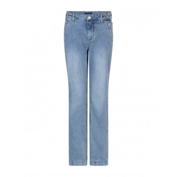 Jeans van Red Button. Deze denim is een echte klassieker met een speelse twist. De mooie middenblauwe wassing geeft de jeans een frisse, tijdloze uitstraling en de subtiele sierknopen aan de voorkant zorgen voor net dat beetje extra. Door de rechte pijp en comfortabele fit is dit een broek die je makkelijk elke dag draagt, van casual tot gekleed.