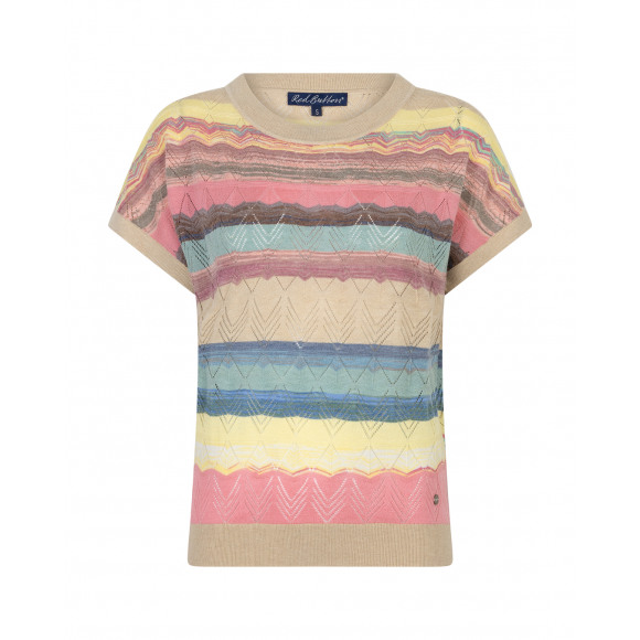 Top met korte mouwen van het merk Red Button met een kleurrijk streeppatroon. Deze luchtige gebreide top combineert zachte pasteltinten zoals roze, geel, blauw en mintgroen met een subtiel ajourpatroon. De ribgebreide boorden aan de hals en onderzijde zorgen voor een mooie afwerking en een comfortabele pasvorm. Dankzij de vrolijke kleuren geeft deze top direct een zomerse uitstraling aan je outfit.