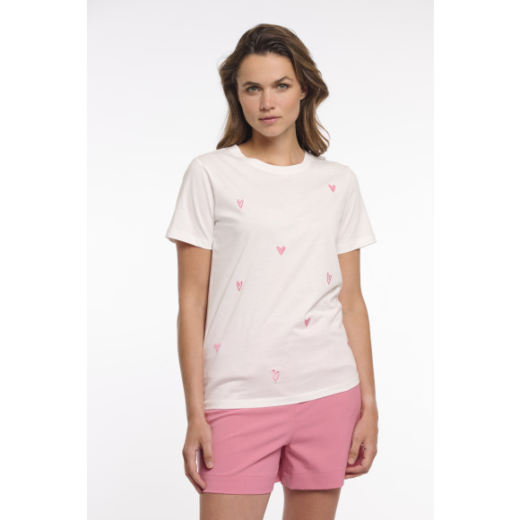 * Details: witte basis met kleine roze hartjesprint, zachte stretchy stof, tijdloze basic met een speelse touch