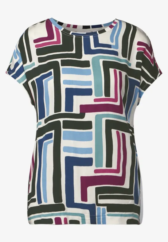 Dit CECIL Shirt voor dames heeft een grafisch patroon en een decoratieve knoopsluiting op de rug. De ronde hals en korte mouwen geven het een klassieke look. De comfortabele pasvorm maakt het perfect om elke dag te dragen.