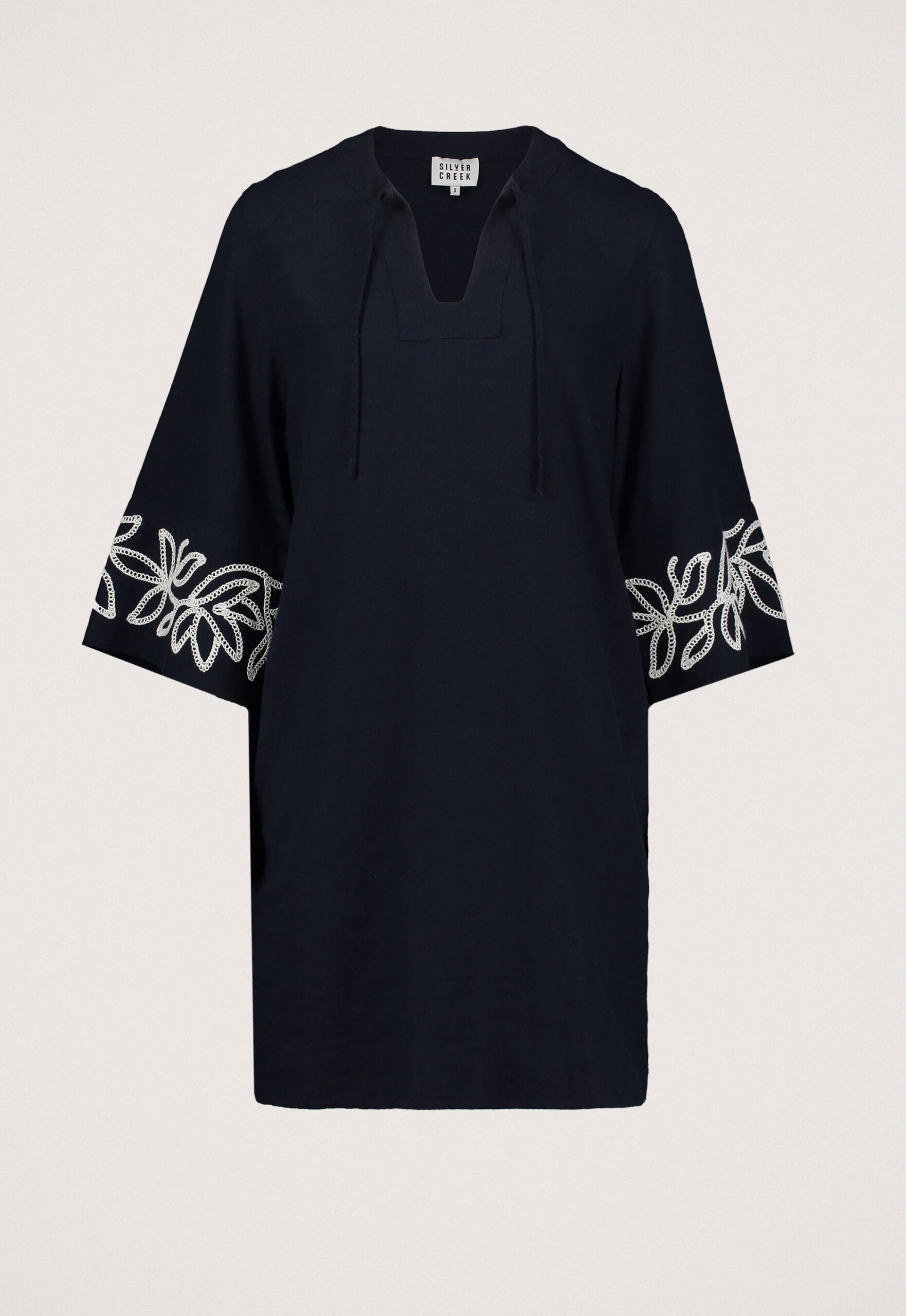 Dit is de Louna Jurk van het merk Silvercreek. Deze jurk heeft een regular fit en is gemaakt van een hoogwaardige linnen-viscosemix, wat zorgt voor een luchtige en comfortabele draagervaring. De jurk heeft een stijlvolle V-hals en korte, wijde mouwen met een contrasterend borduursel dat meteen in het oog springt. Dankzij de trekkoord sluiting in de taille kun je de pasvorm eenvoudig naar wens aanpassen.