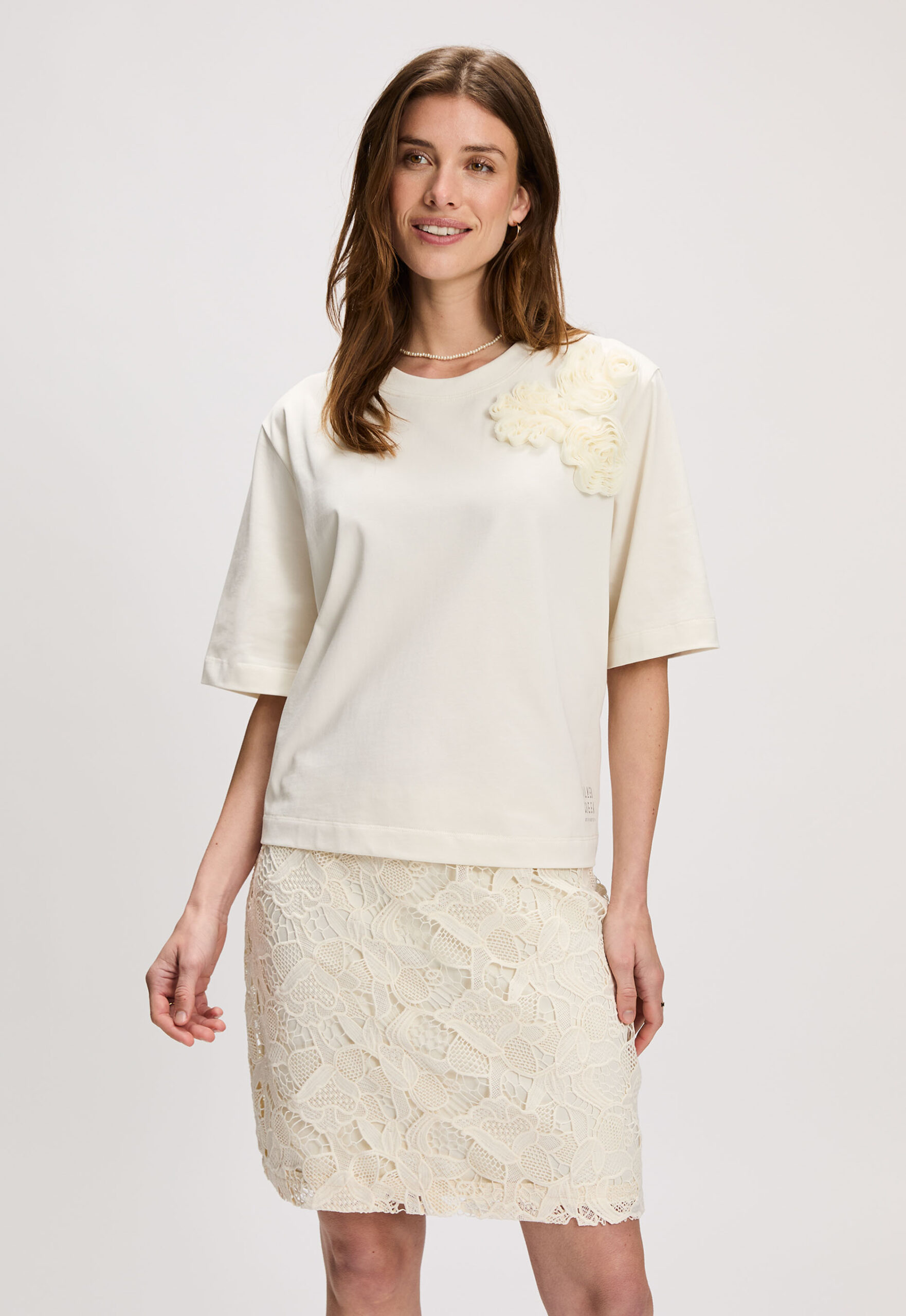 Dit is het Suna T-shirt van het merk Silvercreek. Dit T-shirt is uitgevoerd in 100% katoen, wat zorgt voor een zachte en comfortabele draagervaring. Het T-shirt heeft een ronde hals, korte mouwen en een opvallende 3D-bloemapplicatie op de schouder die een stijlvol accent toevoegt.