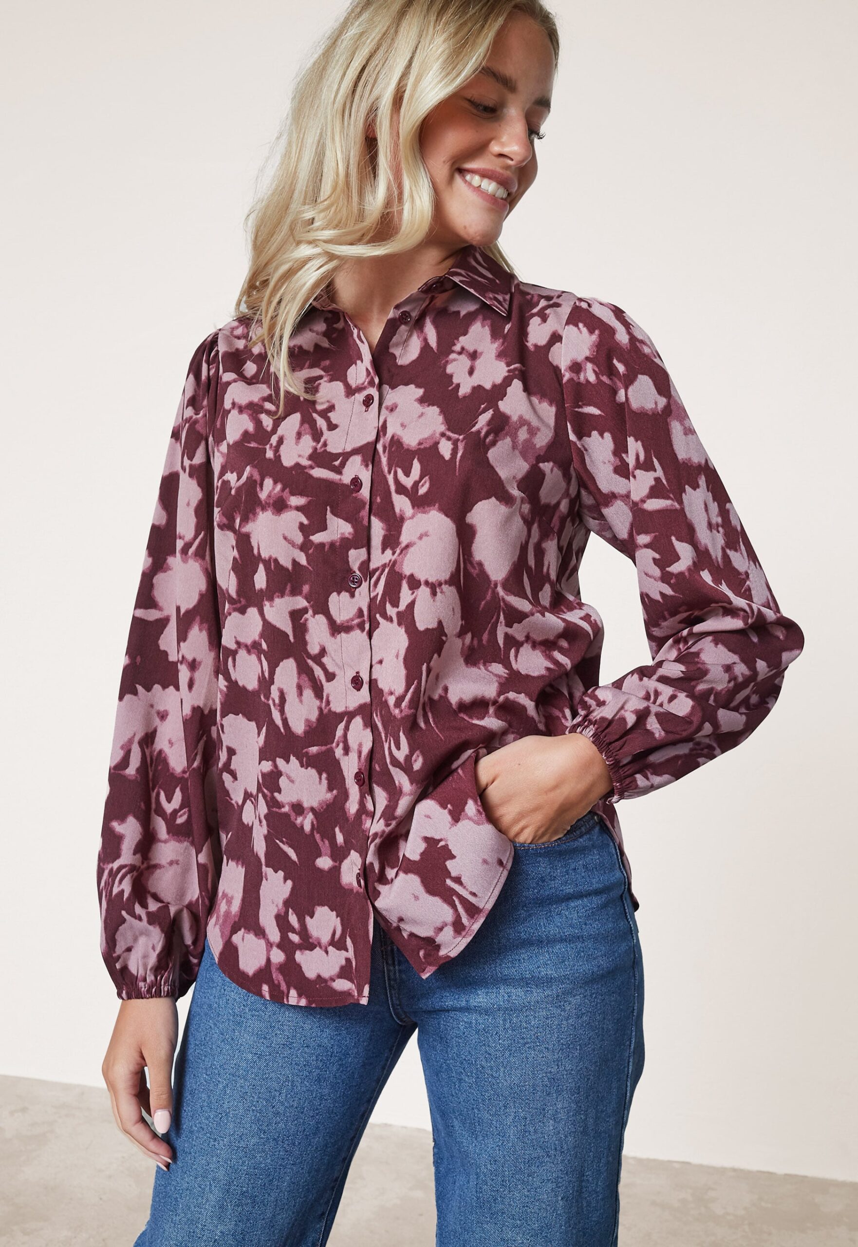 Dit is het 18817 Ebby Shirt van het merk Sisters Point. Het shirt is voorzien van een knoopsluiting en een all-over print. Verder heeft dit item geplooide mouwen met elastische uiteinden.