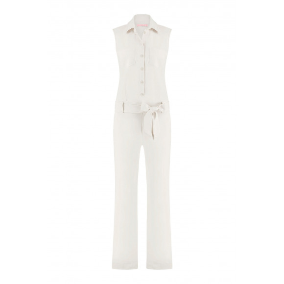 Mouowloze travel jumpsuit van het merk Studio Anneloes. Deze jumpsuit heeft een lange straight leg pijp, knoopsluiting, kraagje en ceintuur van hetzelfde materiaal.