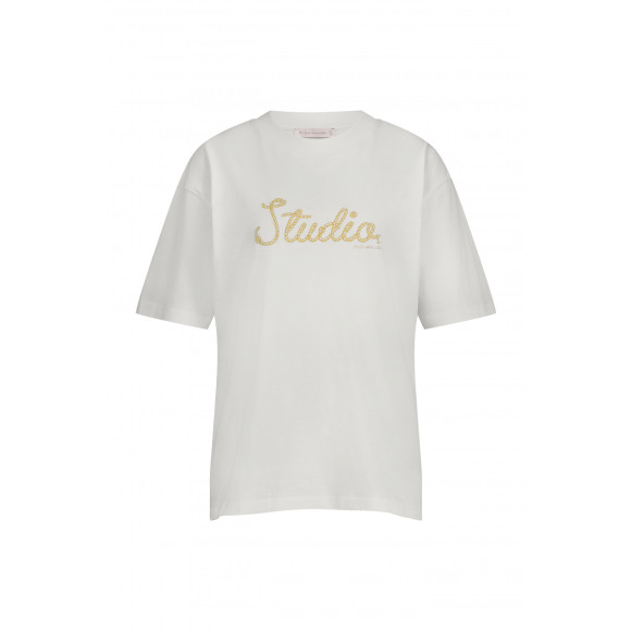 T-shirt met geborduurd logo van het merk Studio Anneloes. Dit shirt heeft een ronde hals en korte mouwen.