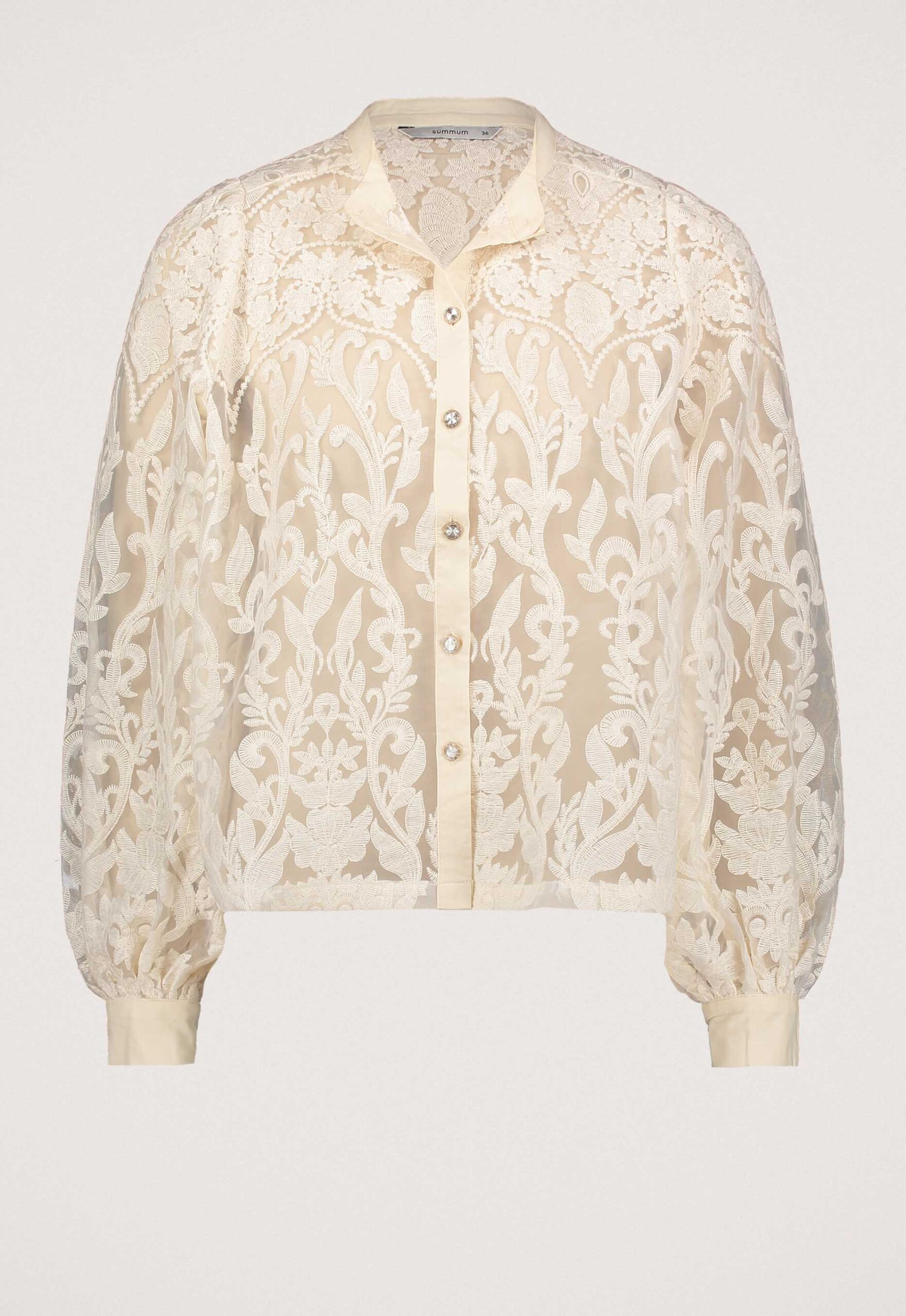 Dit is de 2S3191-12300C7 Flowerlace blouse van het merk Summum. De transparante blouse is gemaakt van fijn kant en heeft een rechte fit. Het model is voorzien van een ronde hals, pofmouwen met manchet en een doorknoopsluiting met fancy parelknoopjes met diamantdetail.